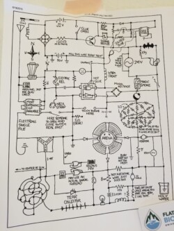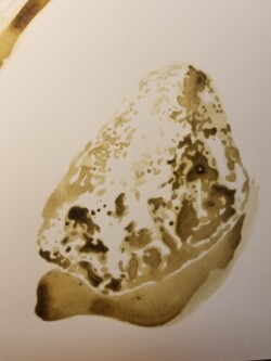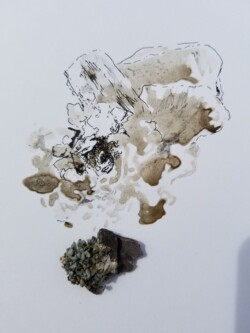 Locally-sourced tannic dye, Flathead Lake water, latex paint, acrylic paint, Chinese Ink, graphite, conte, colored pencil, glaze pencil, thread, and chemically-synthesized upconverting nanoparticle on yupo paper. 20” x 40”