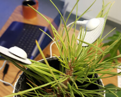 2-year-old Ponderosa pine seedlings subjected to drought conditions of varied severity then rewatered, engaged in continuous Skype call with themselves, projected on opposite wall of gallery; plant-your-own seed station; temporary plant science reading room; galvanometer sensor and synthesizer for sonifying plant sounds; record player that only plays “Secret Life of Plants” record by Stevie Wonder.