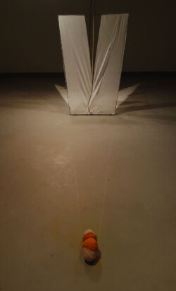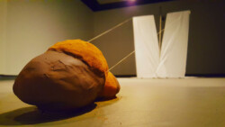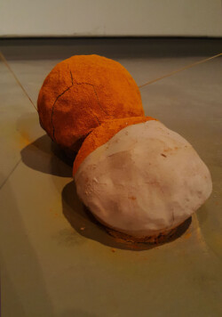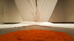 Steel, hand-dyed string, fabric interfacing, graphite, sugar, turmeric, cast copper, raw clay, electronics, plastic-wrapped Mucuna seeds. Arduino with Brian Givens.