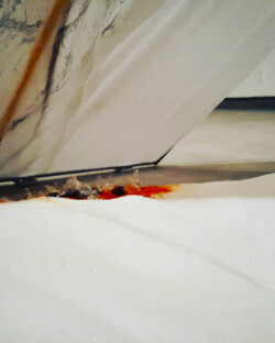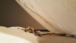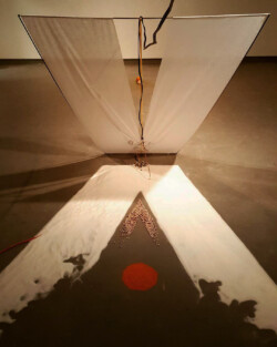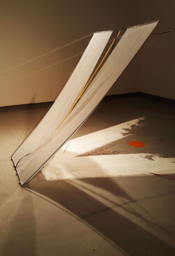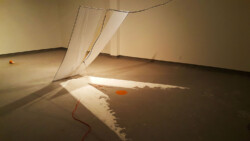 Approx 6’ x 6’ x 8’ This piece focuses on the co-evolutionary relationship between the Mucuna plant and its bat pollinator, creating a rectilinear analogue of the flower. The trapezoidal shape is echoed by a 60-pound pile of sugar on the floor, creating a vertex to entice viewers while also generating associations with traps. As viewers approach the vertex, they trigger a sensor which increases brightness of a light—a visual reference to bats’ auditory interaction with the plant.
