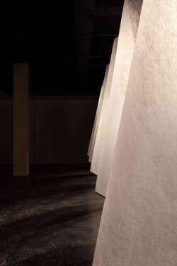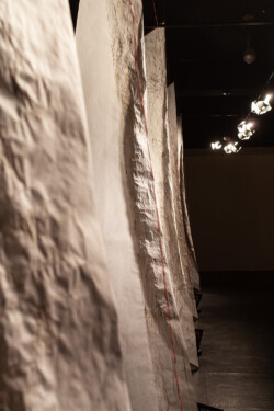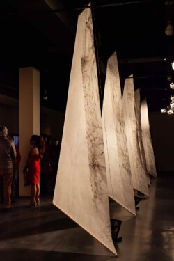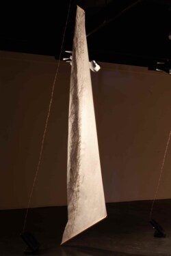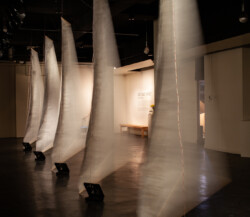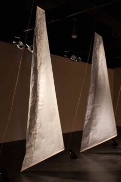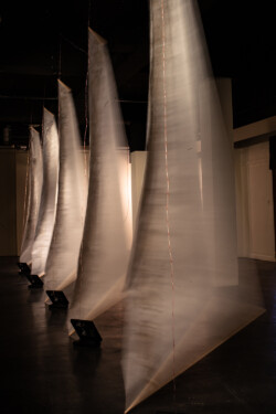 Vellum-paper sails painted with ink made from Ponderosa needles, graphite, conte, gouache; Raspberry Pi single-board computers and custom designed motor controller circuitry; fans. In collaboration with programmer Brian Givens and plant physiologist Gerard Sapés