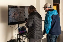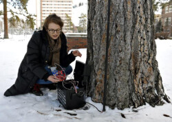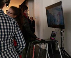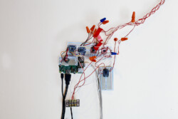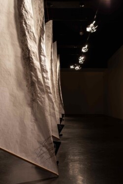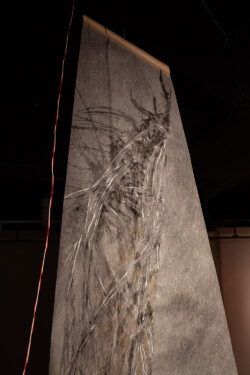 Published in MIT’s Leonardo LABS Abstract Database in 2020. Second Wind is a kinetic, responsive art installation which examines the invisible processes taking place in and around a Ponderosa pine tree. Wind speed data, measured at 20′, 25′, 30′, 35′, and 40′ in the canopy of a Ponderosa pine on the University of Montana campus, is translated into the gallery in real time using two Raspberry Pi single-board computers. This data determines the velocity of the five fans in the gallery. Each fan interacts with a suspended vellum structure which moves more or less depending on wind speed. The vellum is painted with an ink made of fermented pine needles from the tree, and depicts changes in canopy density based on height. Second Wind aims to raise questions about the limits of perception and knowledge, limits which are especially important to investigate as our capacity to shape our ecosystems continues to grow.