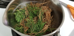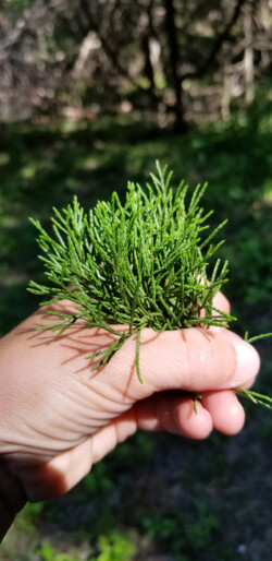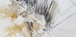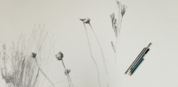 Dye made from locally-sourced cedar and Lake Ogallala water with graphite on paper, with digital overlay of 1 minute of MIDI biodata recorded from an eastern red cedar (red) and mixed prairie grasses directly below its canopy (blue). 3’ x 4’.