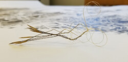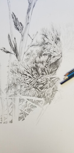Because of increased human settlement and resulting changes in our fire regimes, eastern red cedar is increasingly outcompeting mixed prairie grasses in the Ogallala, NE area. The tree is a pioneer species indicative of the beginning of forest succession. This shift from grassland to forest poses a particular problem for species such as the Sand Hill crane, since the Big Bend area of the Platte River (near Ogallala) is a pinch point in its migration path. Succession depicts a series of mixed prairie grasses found on site at Cedar Point Biological Station within the shape of one large cedar. Tension between figure and ground is meant to evoke the tensions between these two groups of plants in the ecosystem.